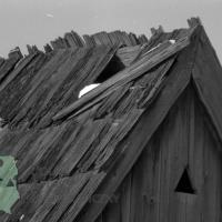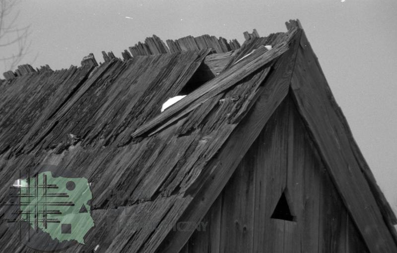 fotografia przedstawia fragment ściany szczytowej drewnianego budynku gospodaczego