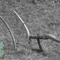 fotografia przedstawia niekompletny pług z drewnianą grządzielą