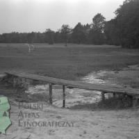 fotografia przedstawia drewnianą kładkę przez rzekę, na tle rozlewisk i bagien Uwagi:- Winduga jest obecnie dzielnicą Klementynowa