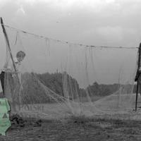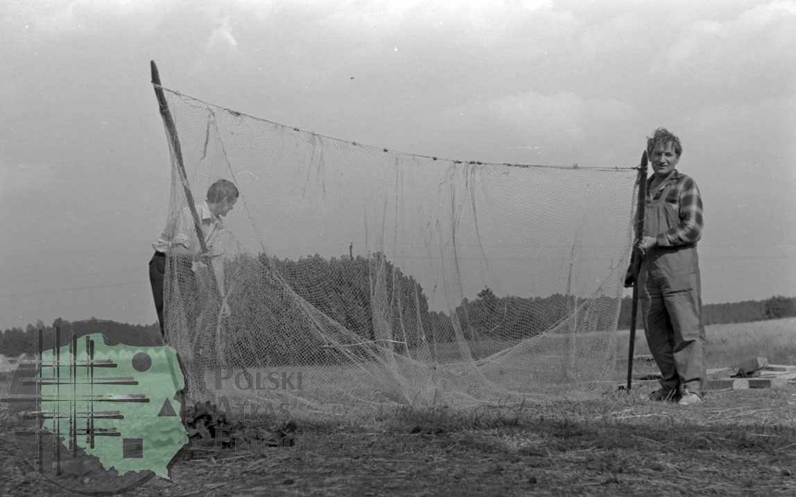 Dwaj mężczyżni prezentujący włok - narzędzie sieciowe do połowu ryb / Kolekcja fotografii Zygmunta Kłodnickiego - Taras (woj. łódzkie)