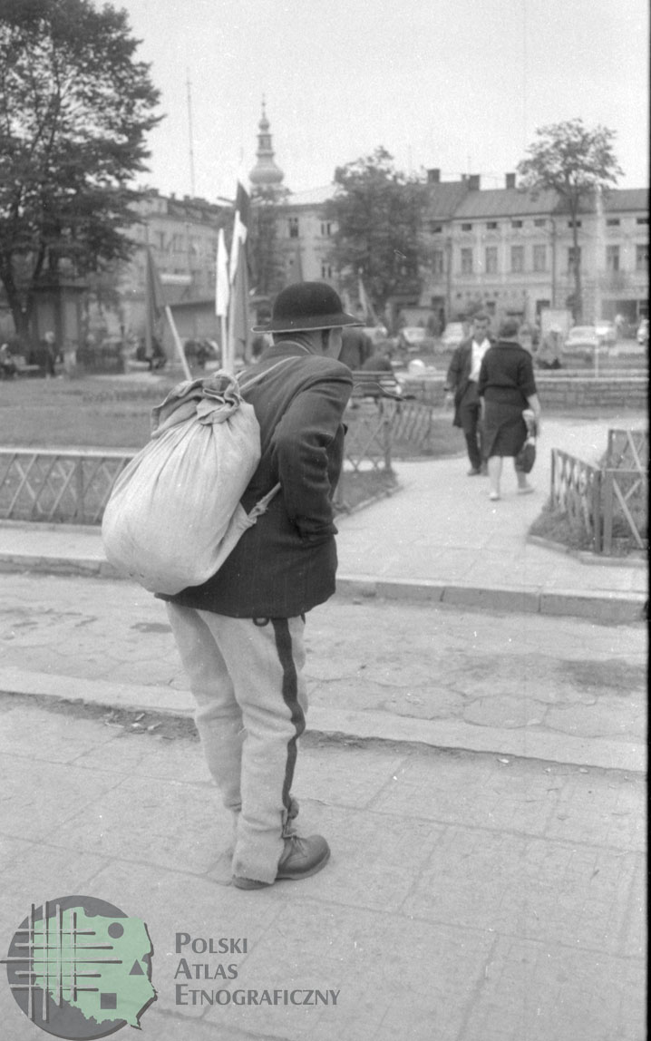 fotografia przedstawia górala z plecakiem na rynku w Nowym Targu
