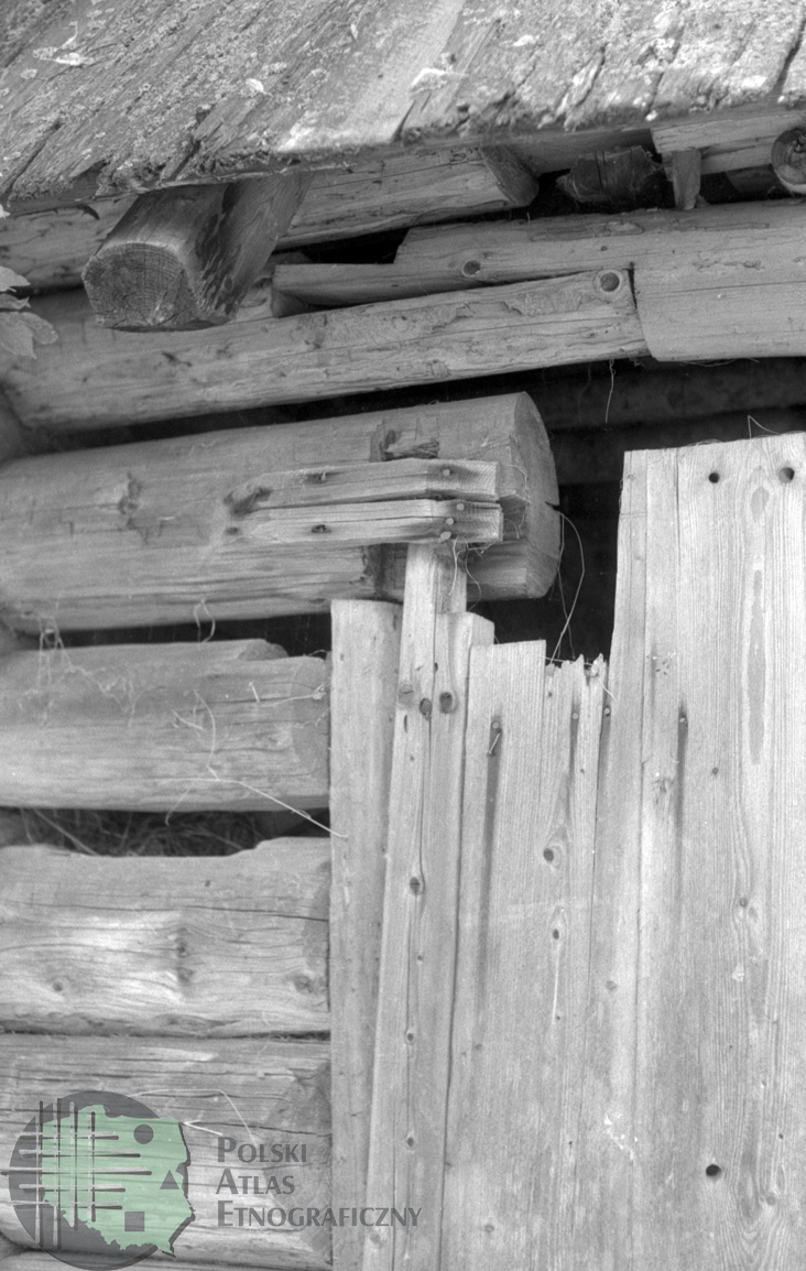 fotografie przedstawiają drzwi wejściowe w ścianie zrębowej oraz fragment zamocowania wrót w ścianie zrębowej budynku gospodarczego