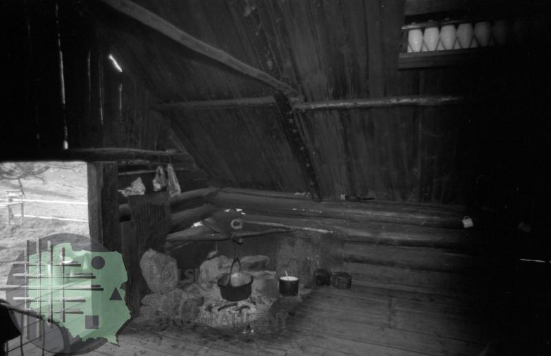 Wędzenie oscypków we wnętrzu szałasu / Kolekcja fotografii Zygmunta Kłodnickiego - Dolina Starorobociańska [dawna hala Stara Robota] (woj. małopolskie)