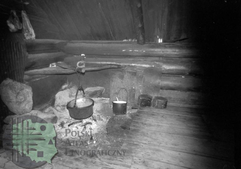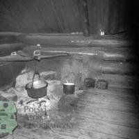 fotografia przedstawia watrę (ognisko z metalowym trójnogiem) i sprzęty w szałasie. Uwaga:- lokalizacja na mapie jest przybliżona