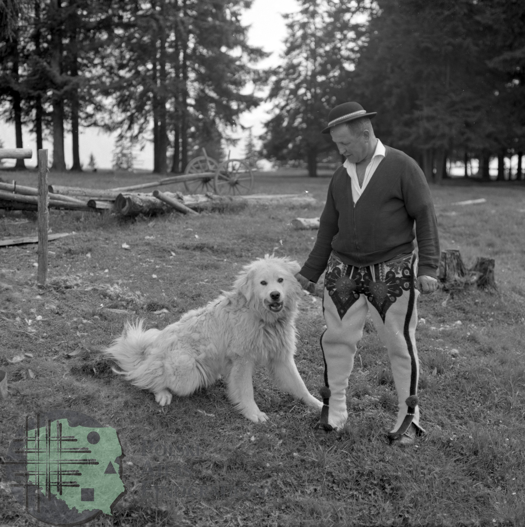 fotografia przedstawia mężczyznę w kapeluszu i góralskich spodniach wełnianych oraz białego psa pasterskiego o imieniu Brinko. Uwaga:- lokalizacja na mapie jest przybliżona