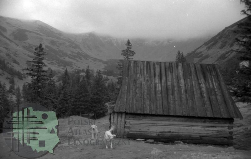 fotografia przedstawia szałas pasterski, przed którym widać dwa psy. Uwaga:- lokalizacja na mapie jest przybliżona