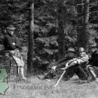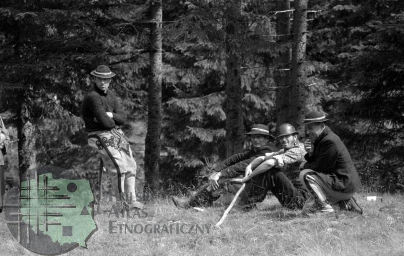 fotografia przedstawia czterech mężczyzn, z których trzech jest w góralskich kapeluszach i spodniach wełnianych; większość z nich siedzi na trawie. Uwaga:- lokalizacja na mapie jest przybliżona