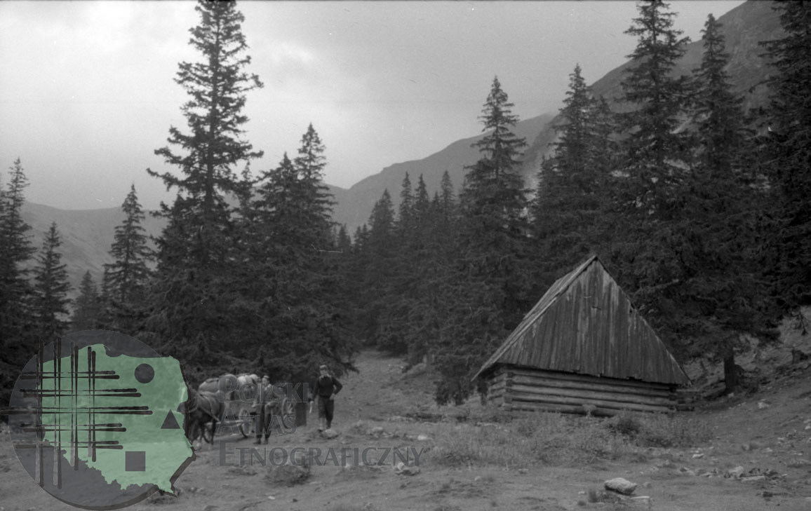 fotografia przedstawia szałas, dwóch mężczyzn (pasterzy krów) i wóz zaprzężony w konia przed wyjazdem pasterzy do Dzianisza. Uwaga:- lokalizacja na mapie jest przybliżona