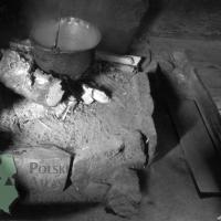 fotografie przedstawiają wnętrze szałasu - płonącą watrę na trzonie umieszczonym w wgłębieniu. Uwaga:- lokalizacja na mapie jest przybliżona