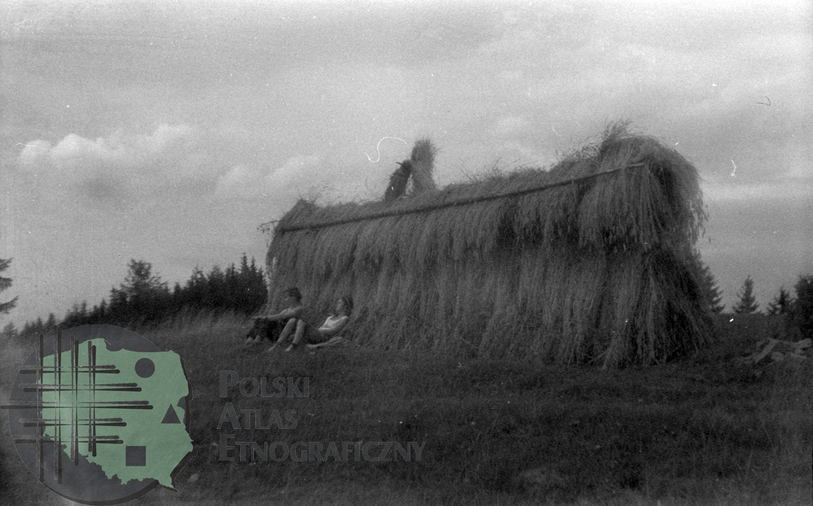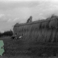 fotografie przedstawiają zboże suszące się na przepłocie i dwie kobiety odpowczywające pod nim.(1,2)