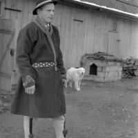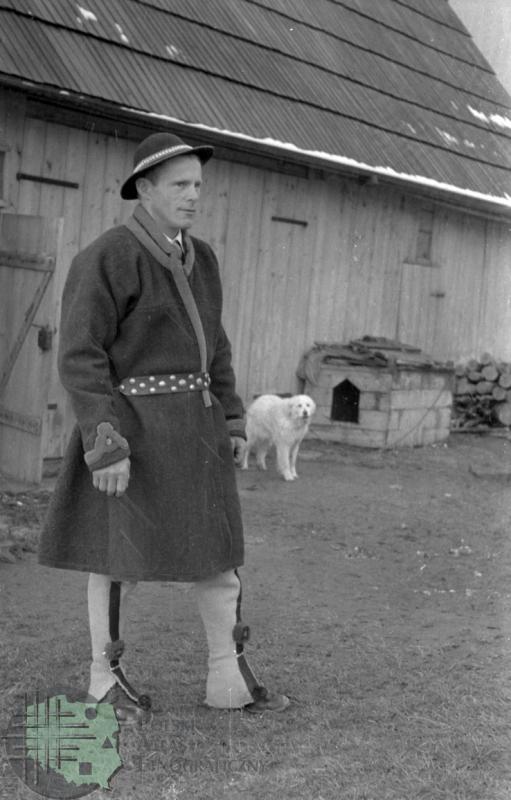 fotografia przedstawia mężczyznę w kapeluszu, sukmanie i wełnianych spodniach; w głębi widać psa na łańcuchu