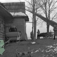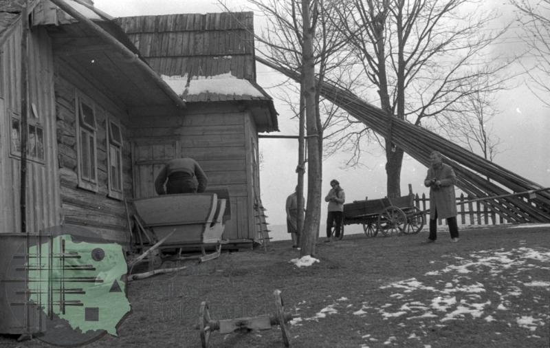 fotografia przedstawia fragment budynku mieszkalnego na Budzowym Wierchu; widać także kilka osób i sanie wyjazdowe