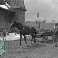 fotografia przedstawia zaprzęg jednokonny (w chomąto) w wozie roboczym, kobietę oraz dwoje dzieci stojących przed budynkiem