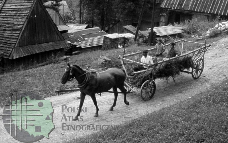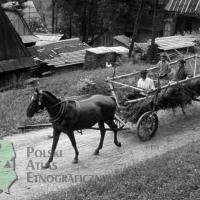 fotografia przedstawia zaprzęg jednokonny (chomąto) oraz trzy osoby siedzące na wozie czterokołowym (drabiniastym)