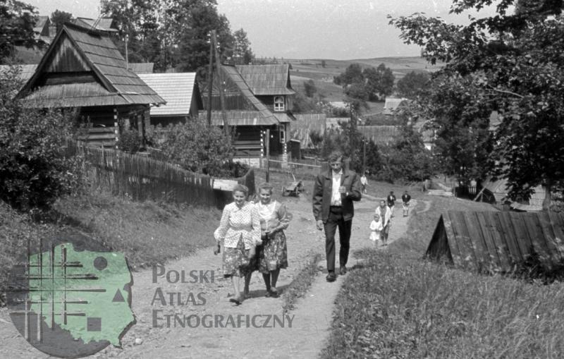 Grupka osób idąca drogą wśród drewnianych zabudowań / Kolekcja fotografii Zygmunta Kłodnickiego - Szczawnica (woj. małopolskie)