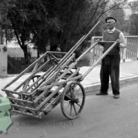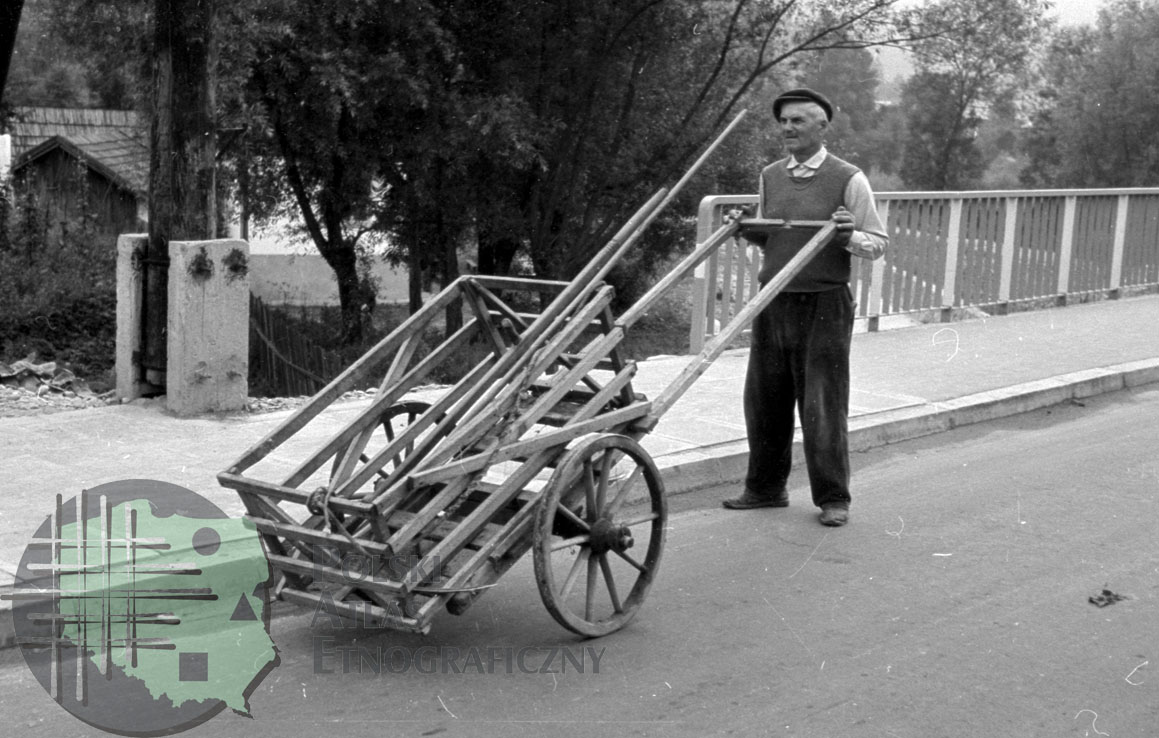 fotografia przedstawia mężczyznę trzymającego wózek dwukołowy z dwoma dyszelkami (w tle widać most nad rzeką Dunajec)