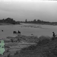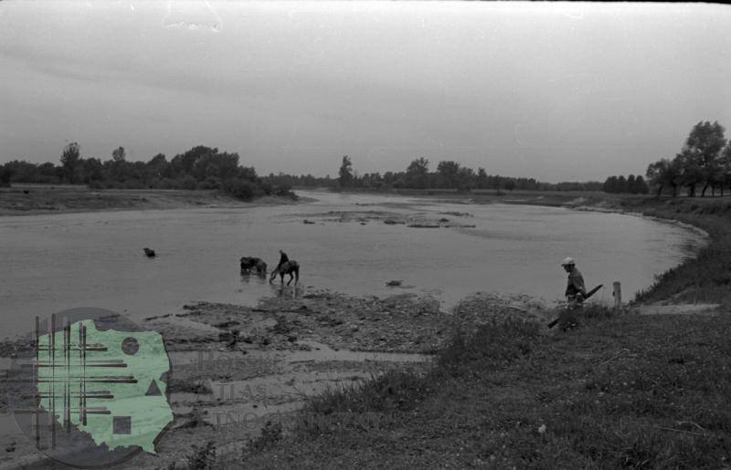 fotografia przedstawia widok na rzekę Wisłokę (1), bydło przeprawiające się przez rzekę (2)