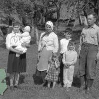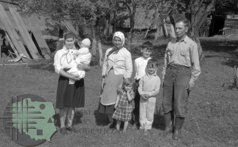 fotografie przedstawiają stojące osoby (w tym informatorów): dwie kobiety w chustkach, mężczyznę oraz czworo dzieci (dwóch chłopców, dziewczynkę i niemowlę)