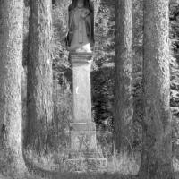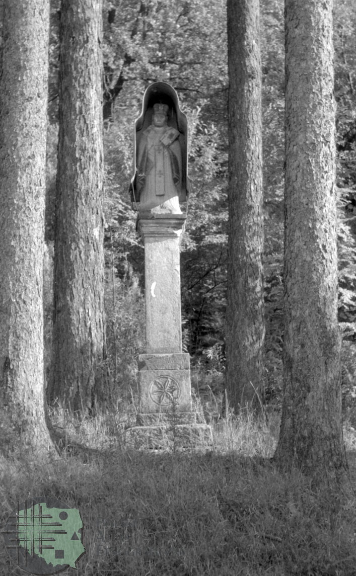fotografia przedstawia kapliczkę słupową z kamienną figurę. Uwaga:- lokalizacja na mapie jest przybliżona