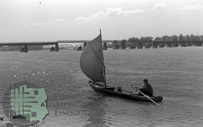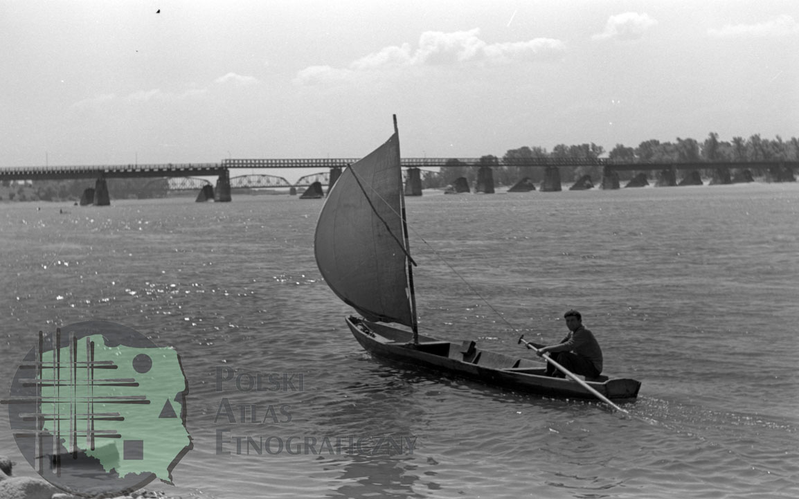 fotografia przedstawia łódź rybacką z żaglem i wiosłem pychowym, w której siedzi mężczyzna, w tle widać most na Wiśle