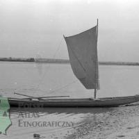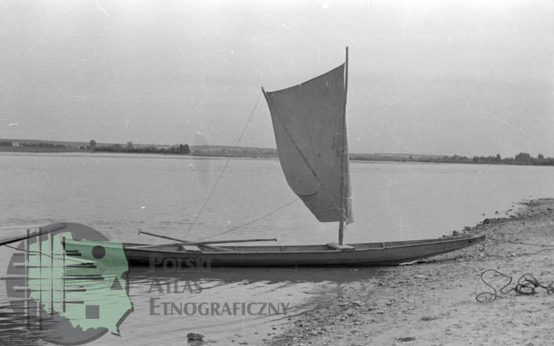 fotografie przedstawiają łódź z rozpiętym żaglem stojącą na brzegu Wisły (1) oraz dwóch mężczyzn płynących łodzią z wiosłem sterowym (2)