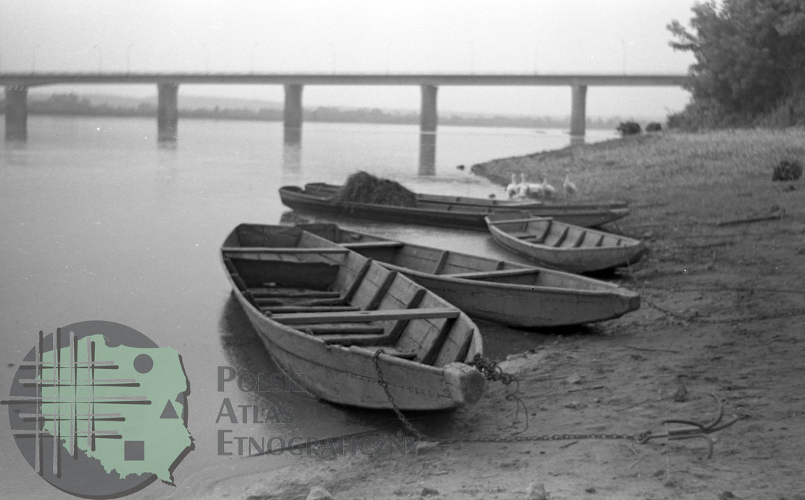 fotografie przedstawiają cztery łodzie; przy pierwszej widać kotwicę, na dalszym planie przy łodziach stoją rybacy (2), w tle widać most na Wiśle. Uwaga:- w odległości ok. 4 km od siebie znajdują się dwie wsie Opoczka Mała i Opoczka Duża, stąd lokalizacja miejscowości Opoczka na mapie jest przybliżona