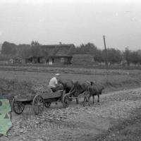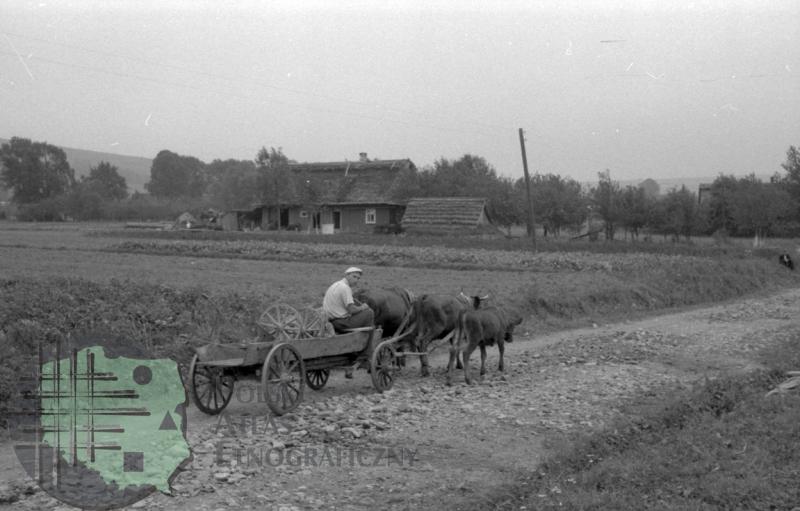 fotografia przedstawia mężczyznę siedzącego na wozie czterokołowym oraz zaprzęg wołowy; w głębi widać zagrodę