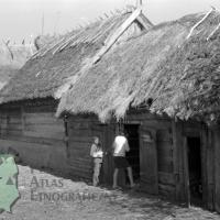 fotografia przedstawia drewniany budynek mieszkalny i budynki gospodarcze; obydwa kryte strzechą. Do budynku zagląda przez drzwi kobieta z chłopcem