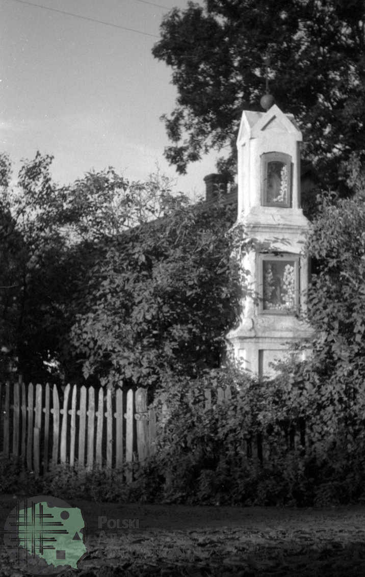 fotografia przedstawia kapliczkę i płot sztachetowy