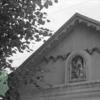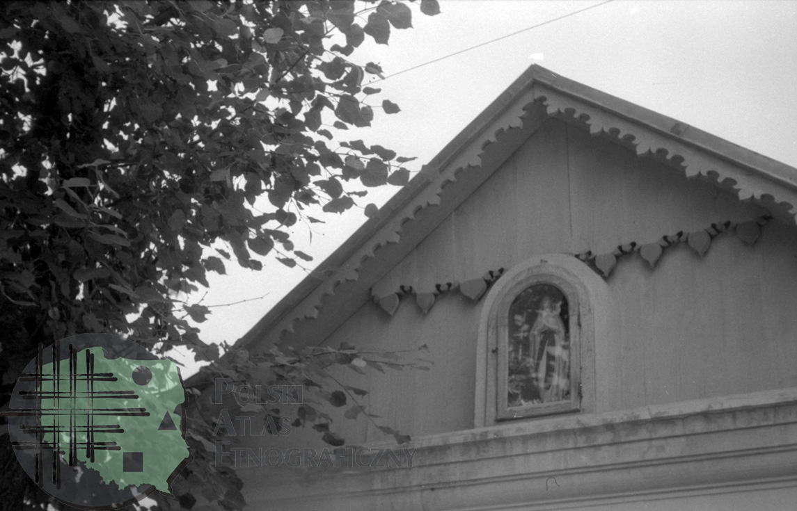fotografia przedstawia kapliczkę wnękową w ścianie szczytowej budynku mieszkalnego, pod dachem widoczne są ażurowe drewniane zdobienia