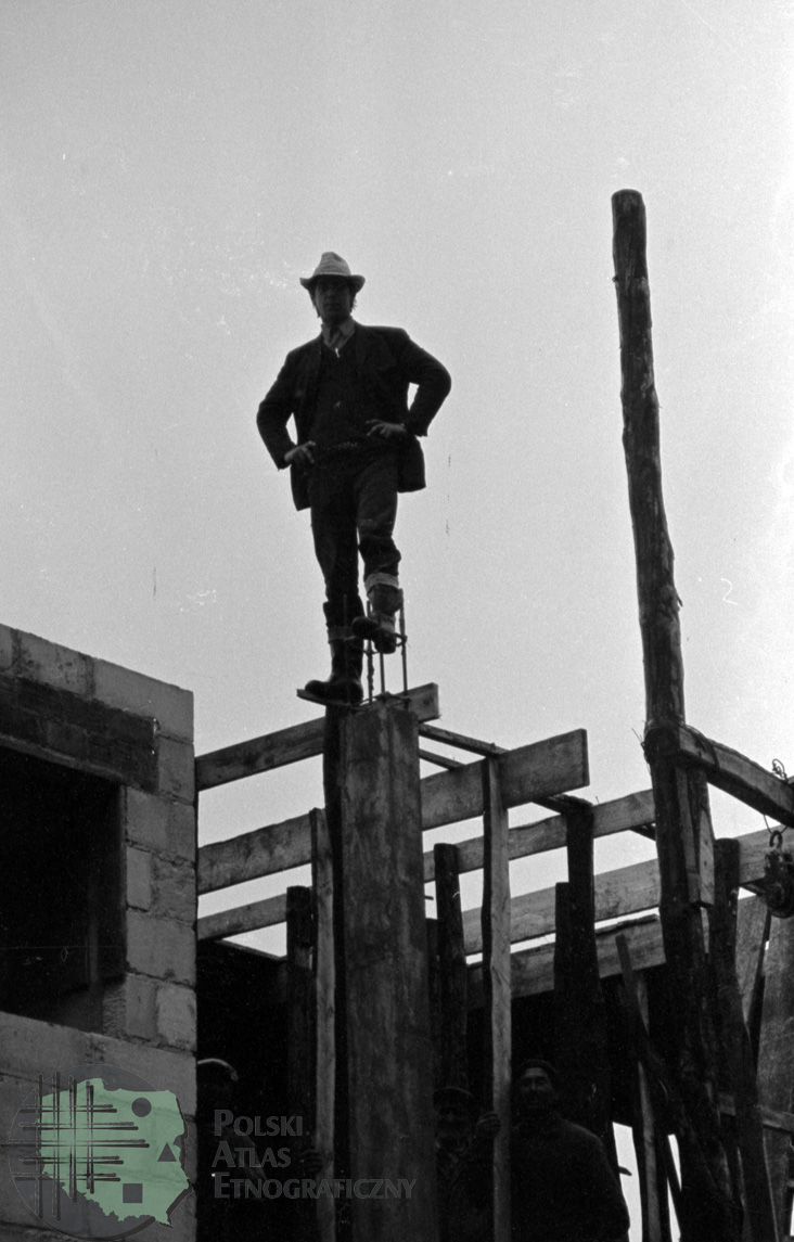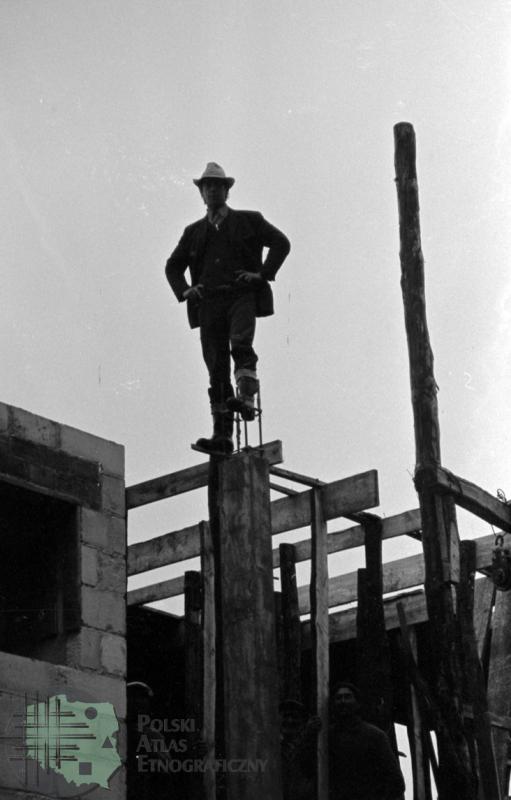 fotografia przedstawia mężczyznę budującego plebanię stojącego na rusztowaniu