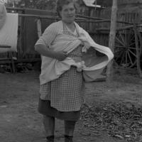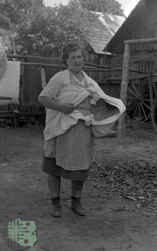 Kobieta demonstrująca technikę wiązania chusty do zbierania chwastów / Kolekcja fotografii Zygmunta Kłodnickiego - Babice (woj. podkarpackie)