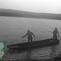 fotografia przedstawia dwóch mężczyzn na łodzi rybackiej, jeden z nich posługuje się wiosłem pychowym. Uwaga:- Bartkówka jest obecnie dzielnicą Dynowa