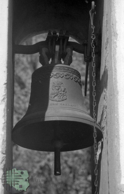 fotografia przedstawia dzwon (za dzwonnicą znajduje się dawna cerkiew św. Męczennicy Paraskewii - obecnie kościół rzymskokatolicki pw. NMP Królowej Polski)
