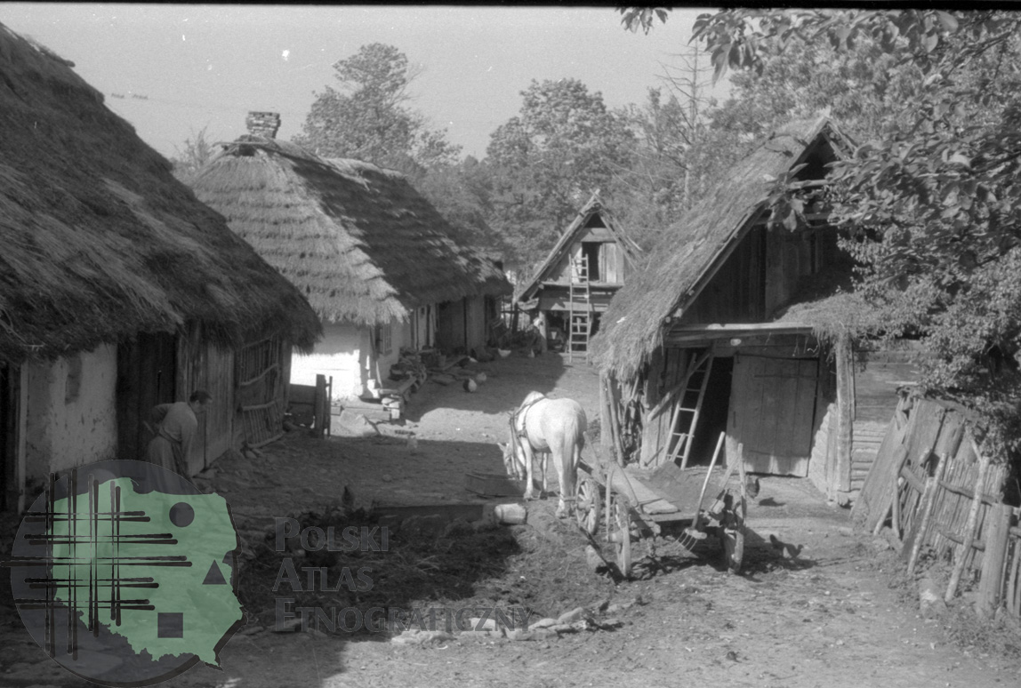 fotografia przedstawia zagrodę; widać także kobietę oraz wóz czterokołowy zaprzężony w konia