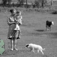 fotografia przedstawia stojącą kobietę z dzieckiem na rękach w strojach odświętnych na tle zagrody, widoczny jest też pies.
