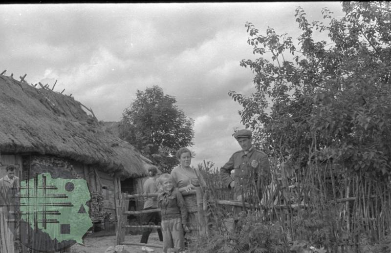 fotografia przedstawia trzy osoby stojące przed zagrodą. Uwaga:- fotografia powstała w trakcie badań etnologicznych po 1 roku studiów Z. Kłodnickiego (międzyuczelniany obóz etnograficzny oraganizowany przez etnologię warszawską pod kierunkiem Anny Kutrzeby-Pojnarowej)
