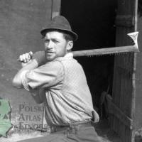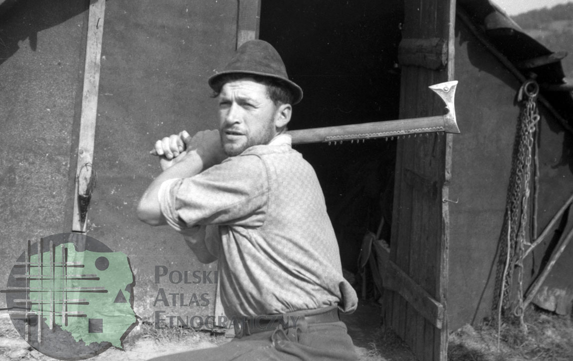 fotografia przedstawia mężczyznę w kapeluszu demonstrującego pracę siekierą