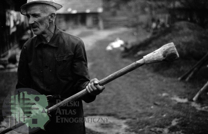 Rybak prezentujący drążek do płoszenia ryb / Kolekcja fotografii Zygmunta Kłodnickiego - Zapałów (woj. podkarpackie)