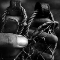 fotografie przedstawiają sposób mocowania ciężarków na dolnej krawędzi sieci (1) i sposób mocowania grzęzów (ciężarków) u dołu sieci matniowej (2)