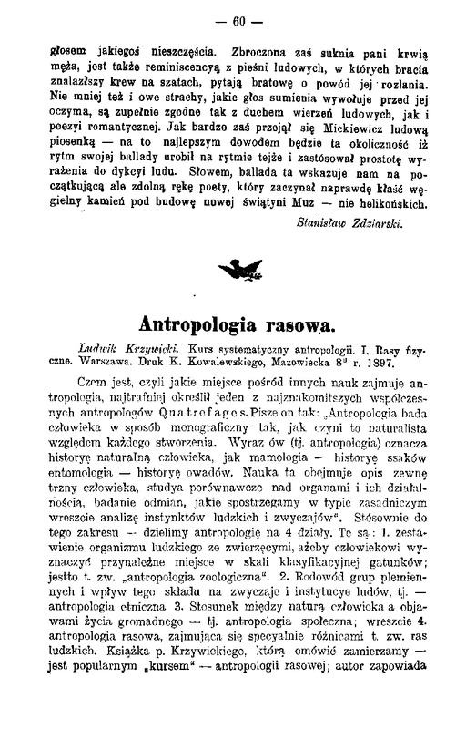 ludzkich. Ksiązka p. Krzywickiego, którą om6wić zamierzamy jest popularnym .kursem" - antropologii rasowej; autor zapowiada.