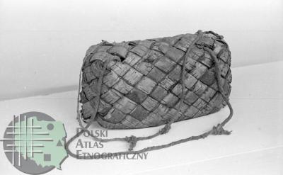 fotografia przedstawia kosz (kobiałkę) przezramienną wyplecioną techniką taśmowo-krzyżową