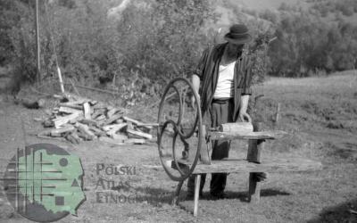 fotografia przedstawia mężczyznę obsługującego tokarkę do drewna napędzaną korbą