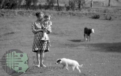 fotografia przedstawia stojącą kobietę z dzieckiem na rękach w strojach odświętnych na tle zagrody, widoczny jest też pies.