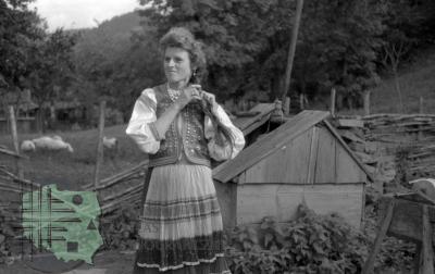 Kobieta w stroju łemkowskim na tle zagrody / Kolekcja fotografii Zygmunta Kłodnickiego - Komańcza (woj. podkarpackie)