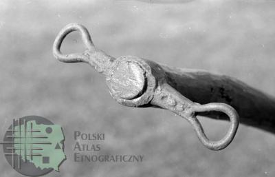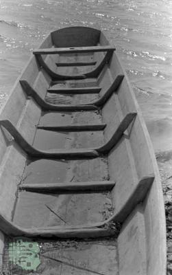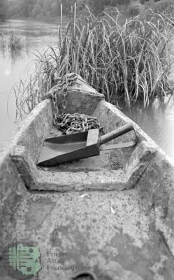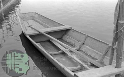fotografia przedstawiają łódź rybacką; przód łodzi z widocznymi szuflami do usuwania wody (1), oraz tył łodzi rybackiej; widać także fragment wiosła pychowego (2) -