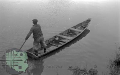fotografia przedstawia łódź rybacką z mężczyzną (rybakiem) pchającym łódź drążkiem na Wiśle -