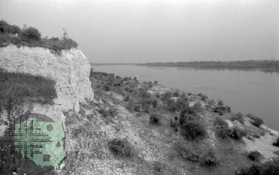 fotografie przedstawiają wysoki brzeg Wisły widziany z miejscowości Opoczka. Uwaga:- w odległości ok. 4 km od siebie znajdują się dwie wsie Opoczka Mała i Opoczka Duża, stąd lokalizacja miejscowości Opoczka na mapie jest przybliżona -