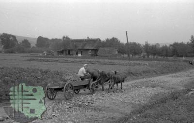 fotografia przedstawia mężczyznę siedzącego na wozie czterokołowym oraz zaprzęg wołowy; w głębi widać zagrodę -