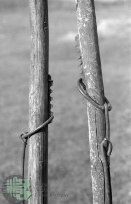fotografie przedstawiają czterokołowy wóz roboczy z jednym dyszlem - widok ogólny (1) oraz widok z przodu (2) ; przed budynkiem widać także jarzmo ramowate oraz młynek do wiania zboża